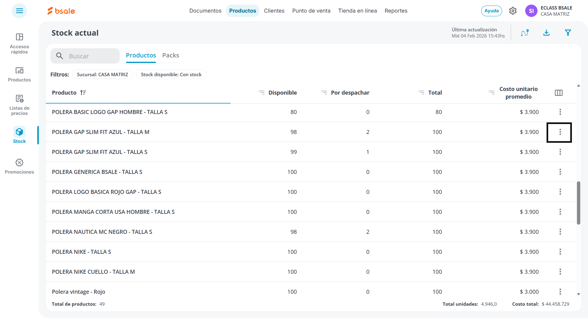 Ingresa en Productos y luego en costado izquierdo ingresas a Stock, por último presiona en Stock actual.