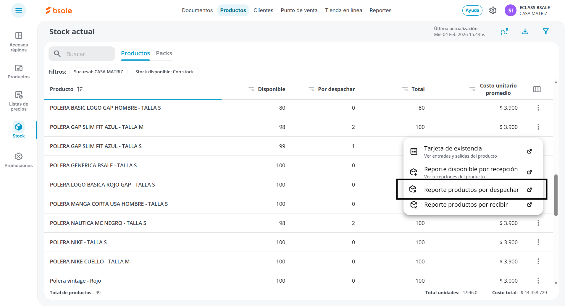 En el reporte de stock actual debes hacer clic sobre el botón de más opciones (tres puntos) del producto que tiene unidades en la columna Por despachar.