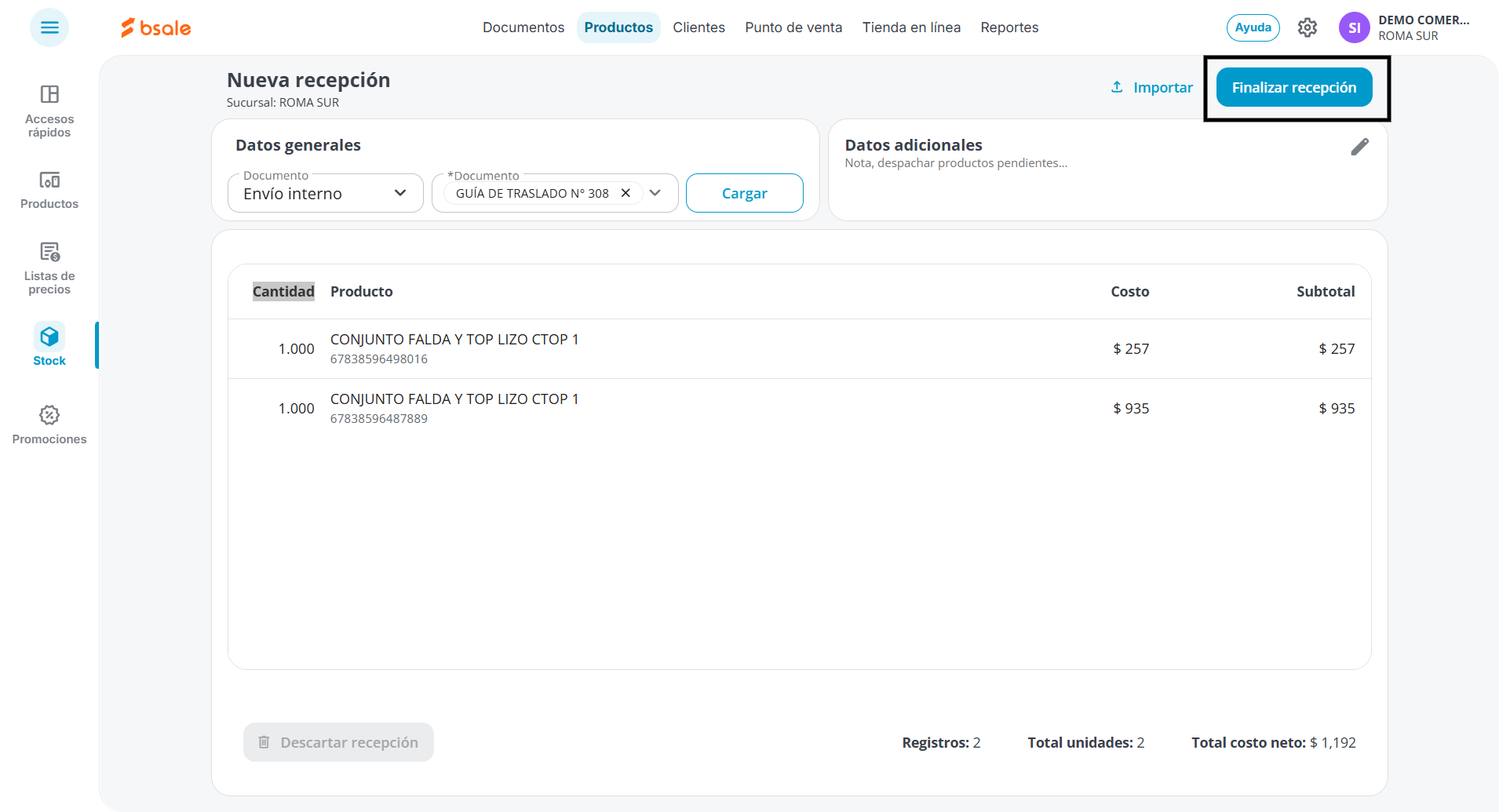 Finalmente, hacemos clic en el botón Finalizar recepción y el stock se habrá sumado al inventario.