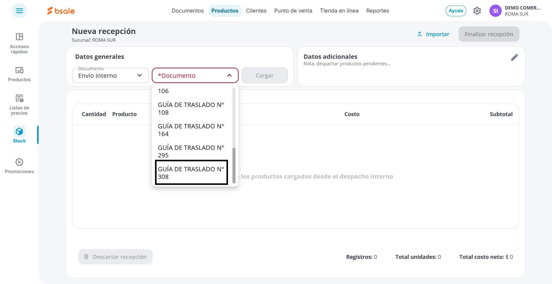 En el menú principal hacemos clic en Productos, posterior en Stock y luego en Recepción. El siguiente paso es seleccionar el documento de recepción. En el listado nos aparecerá una cuarta opción llamada Envío interno, estas son todas las guías de envío entre sucursales que aún no han sido recepcionadas.