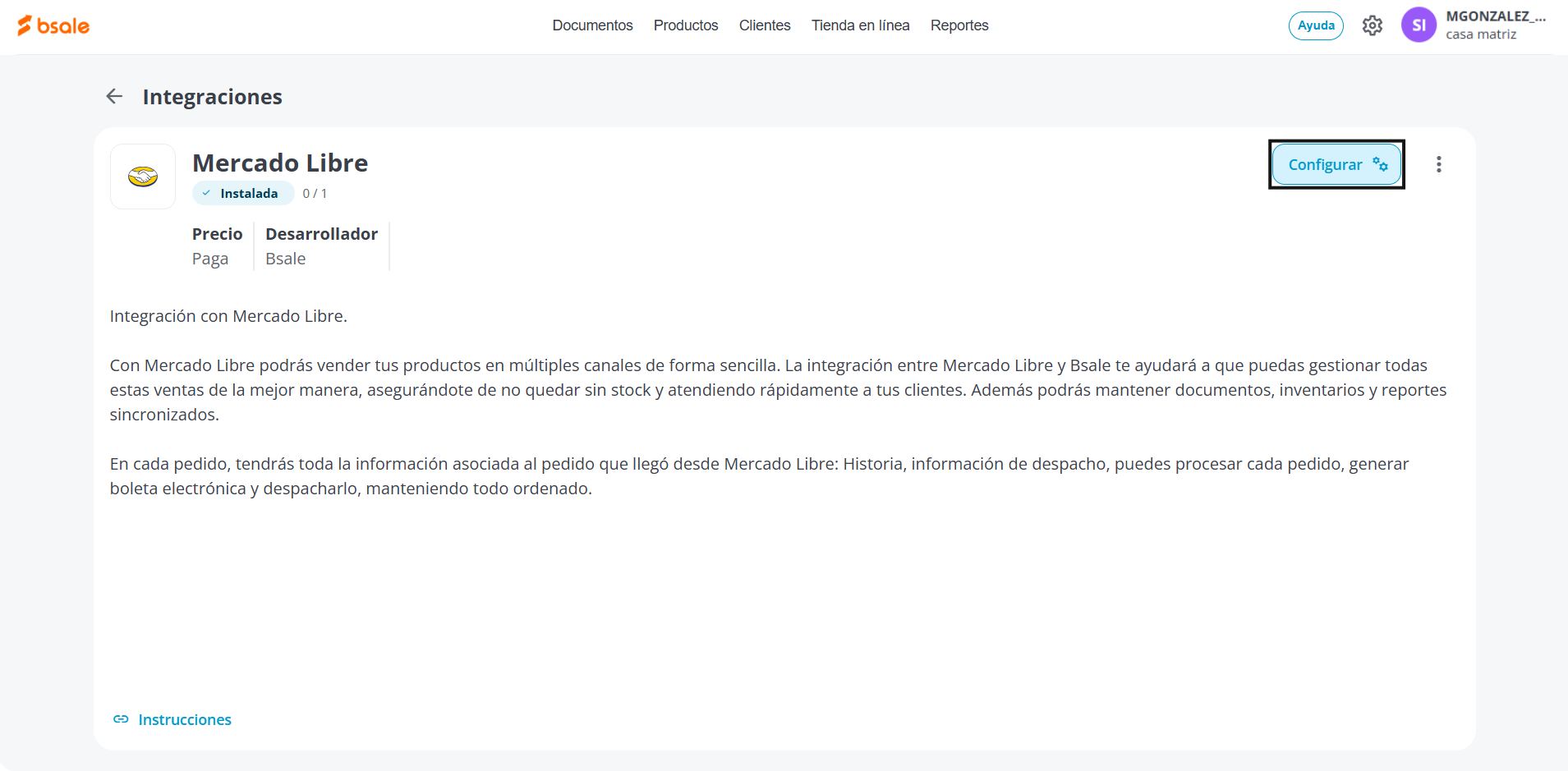 Ahora haciendo clic sobre Instaladas podrás ver todas las integraciones que ya has integrado en tu Bsale. Para revisar la configuración debes seleccionar la integración de Mercado Libre.