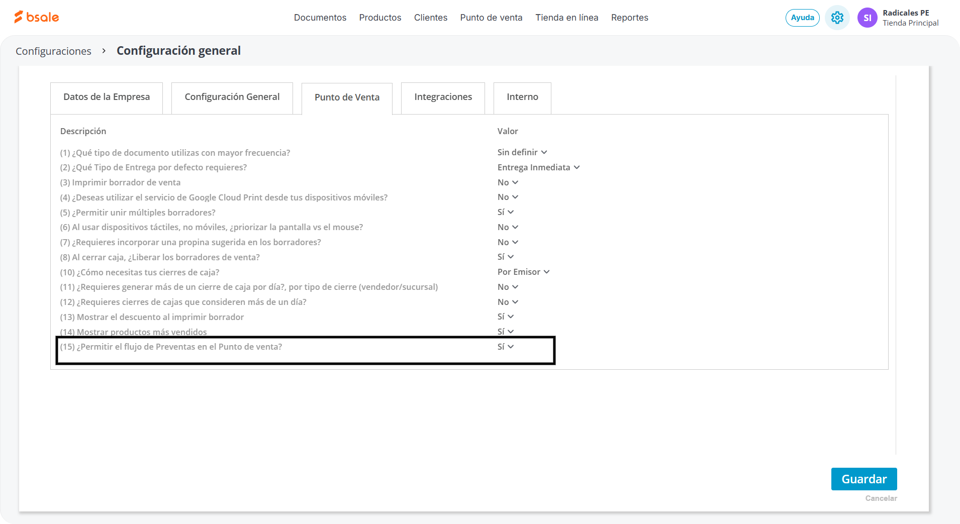 Para comenzar a usar la funcionalidad de Preventas en el Punto de venta, primero debes asegurarte de que la opción esté activada en la configuración general de Bsale.