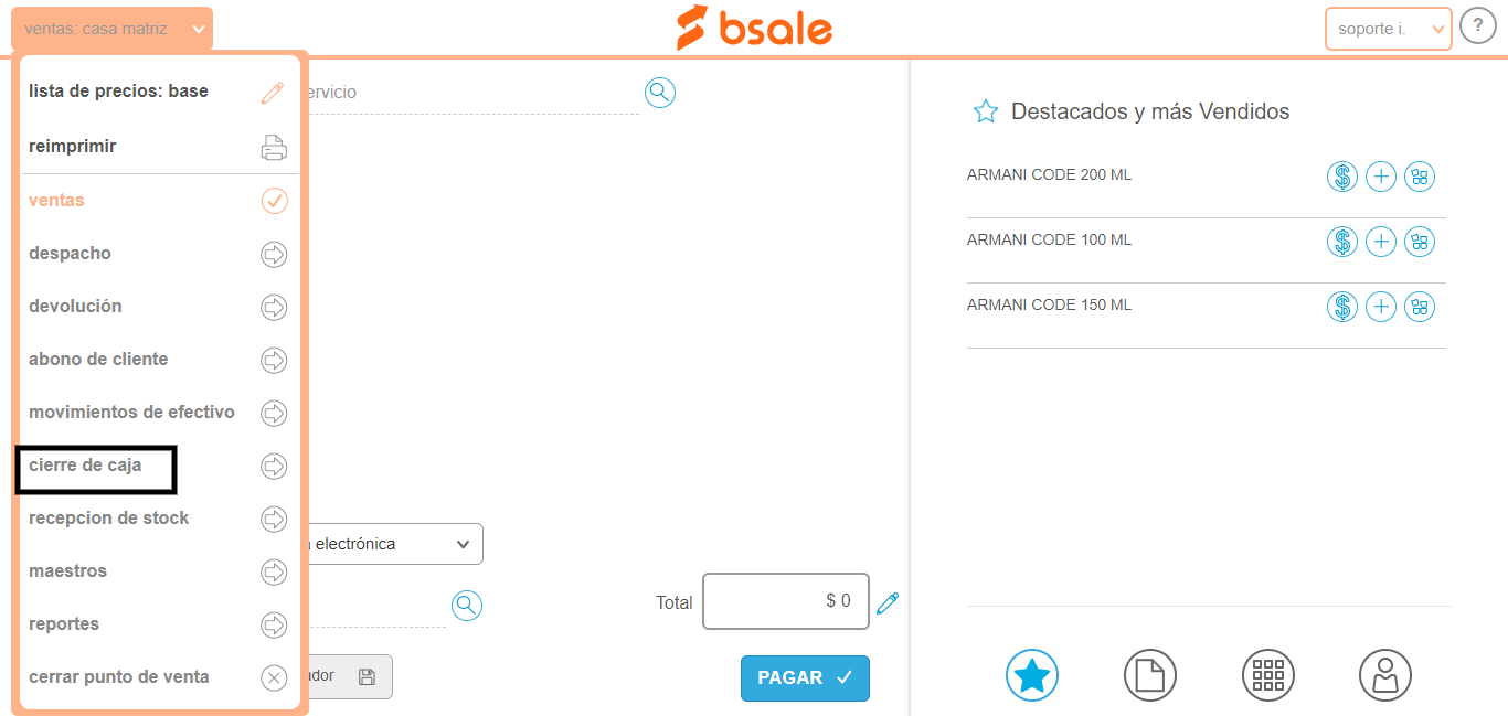 Una vez hayas ingresado al Punto de venta debes ir al menú desplegable en la parte superior izquierda y seleccionar Cierre de caja.
