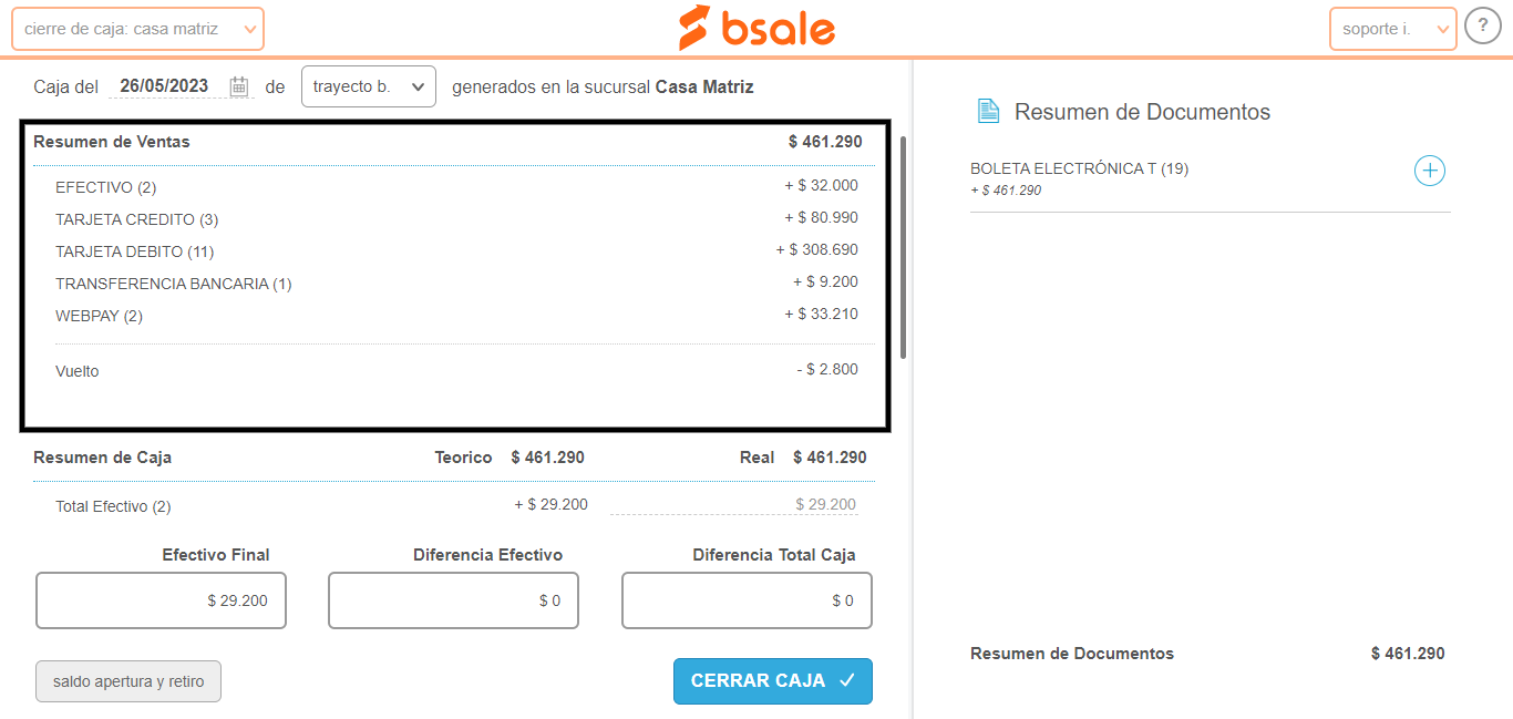 El resumen de caja muestra en detalle lo teórico que tiene el sistema en su caja versus lo real que debiera tener en su caja física.