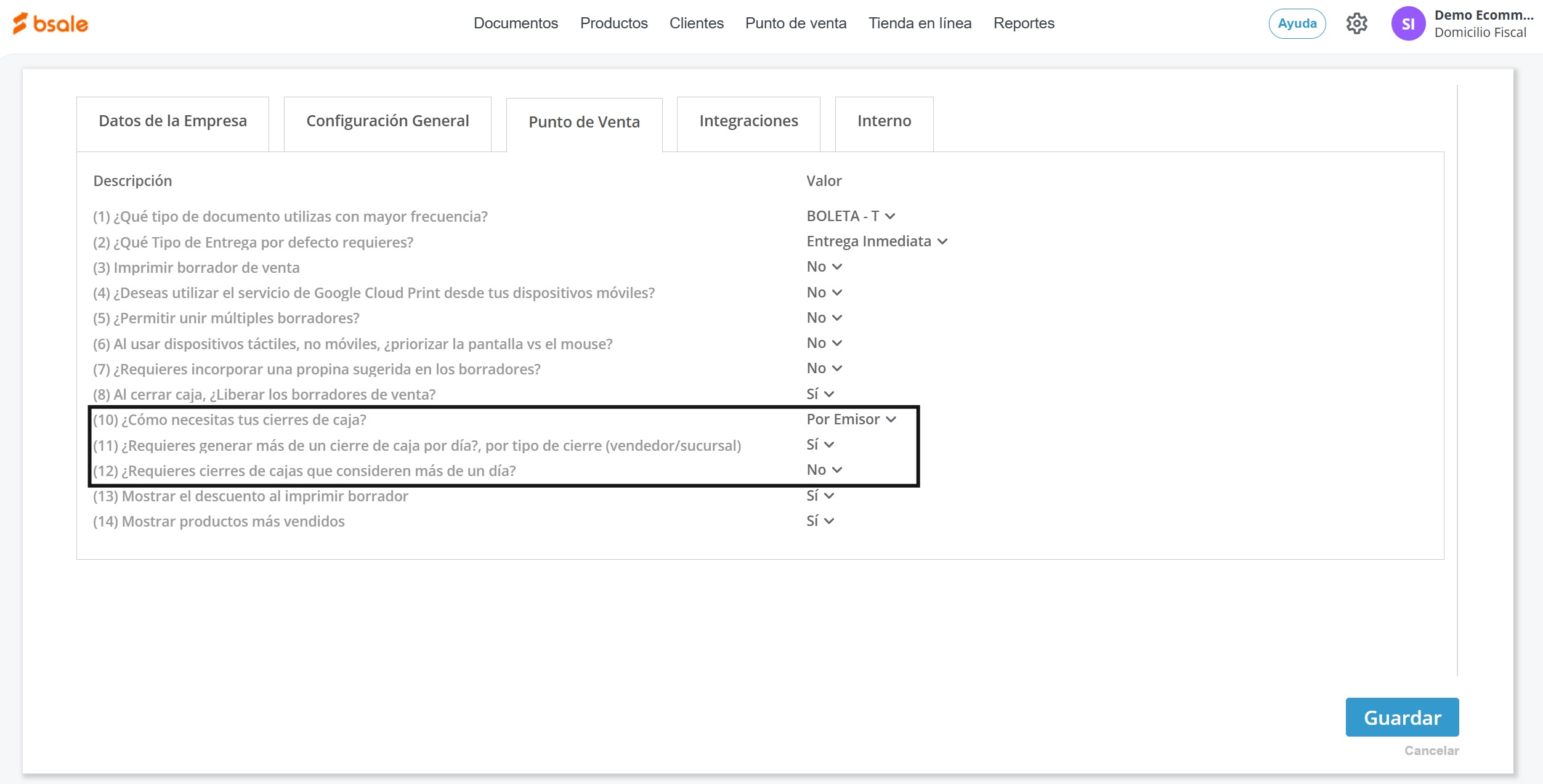 Para configurar los cierres de caja debes ir a Ver más, luego a Configuración y pinchar en General/Punto de venta. Allí deberás configurar las siguientes tres opciones: