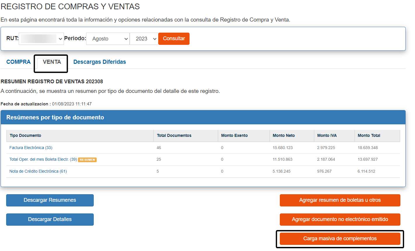 6. Luego selecciona el tipo de registro, en este caso Ventas y presiona carga masiva de complementos.