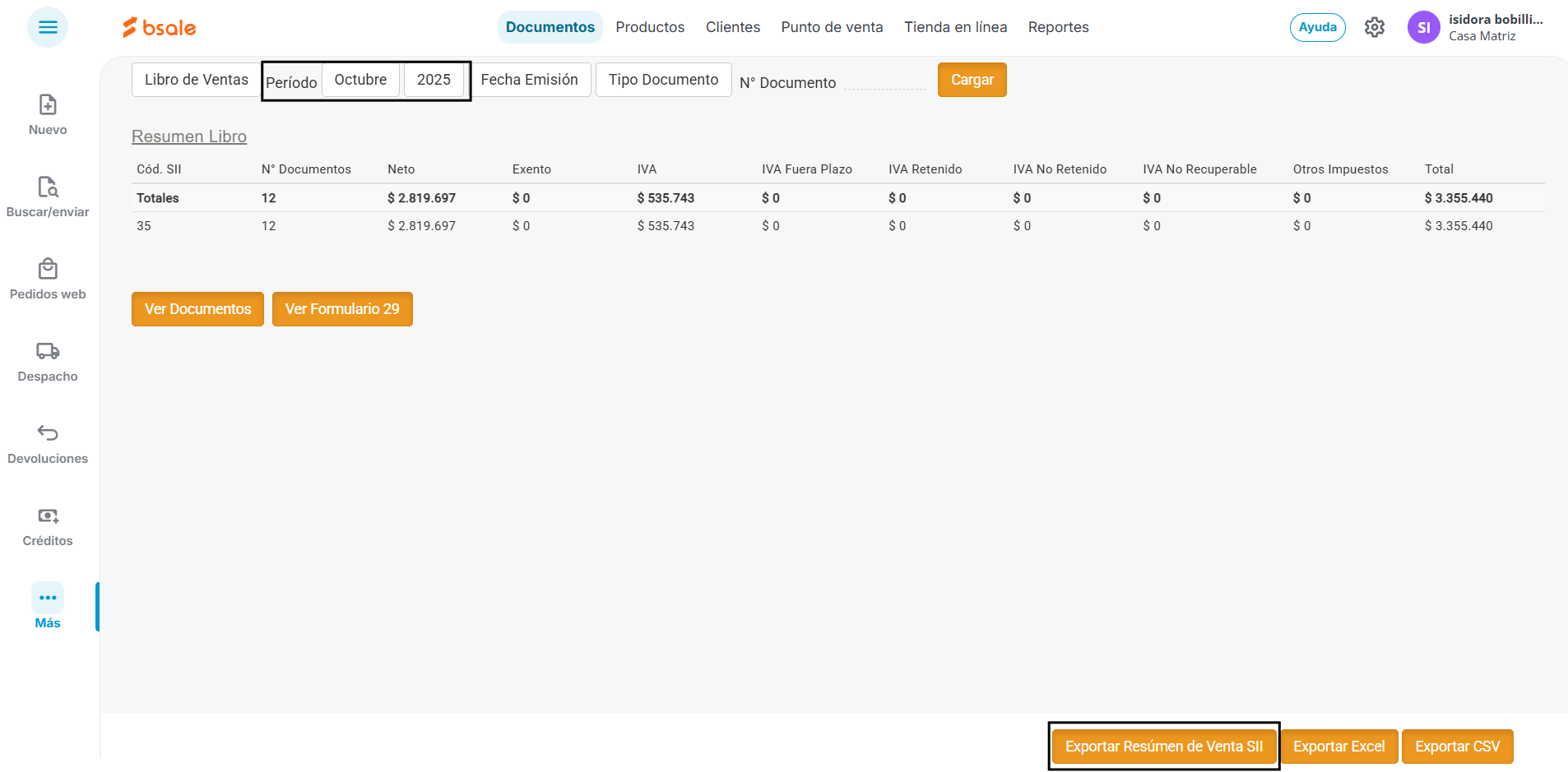 Acá viene lo importante, el archivo que te entregara bsale viene listo para cargarlo en el complemento de ventas del SII, si viene listo con el mismo formato que requiere el SII.