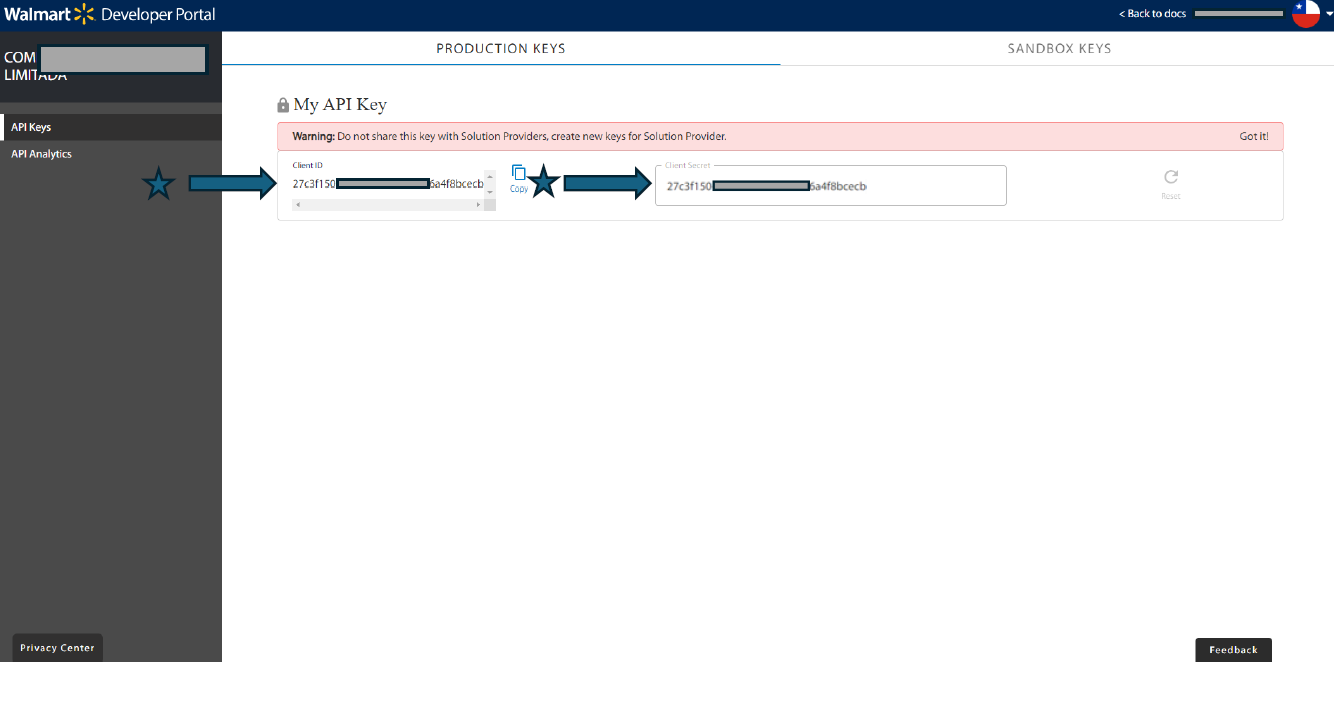 Para partir con la conexión, necesitamos 2 datos del Seller center de Walmart, estos son: CLIENT_ID y CLIENT_SECRET.