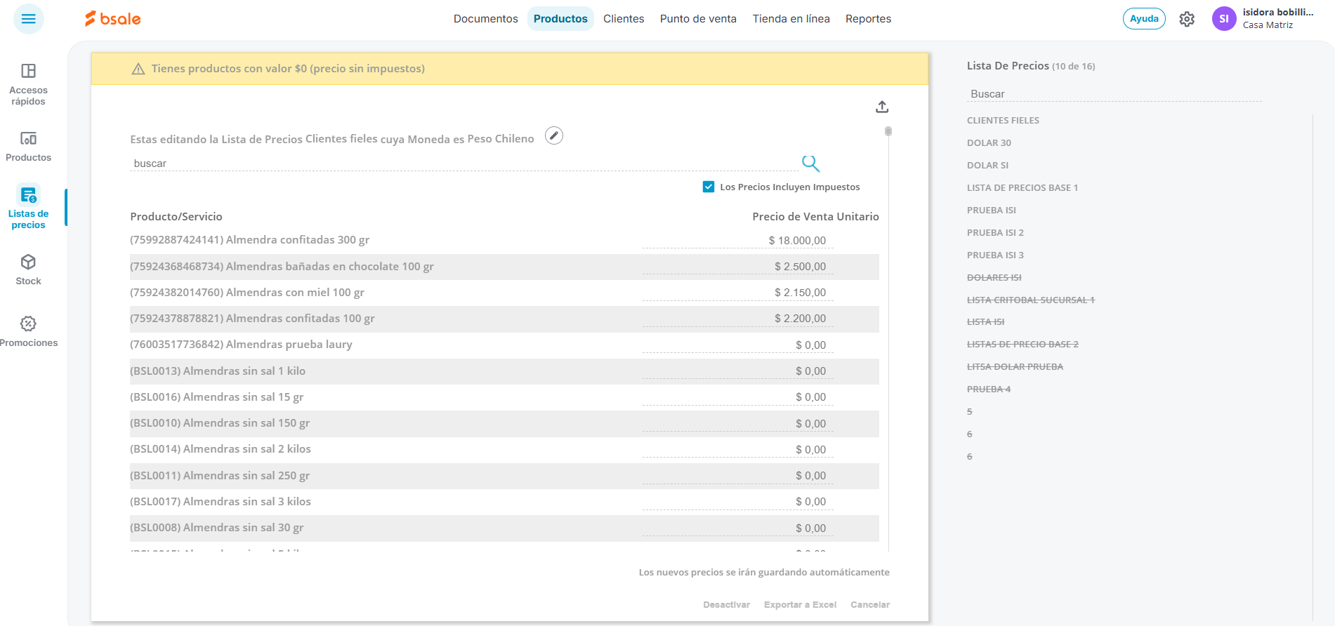 Los precios se comunicarán una vez que se actualice Bsale, la recomendación una vez realizada la conexión es descargar y cargar masivamente los precios con la función “Importar”