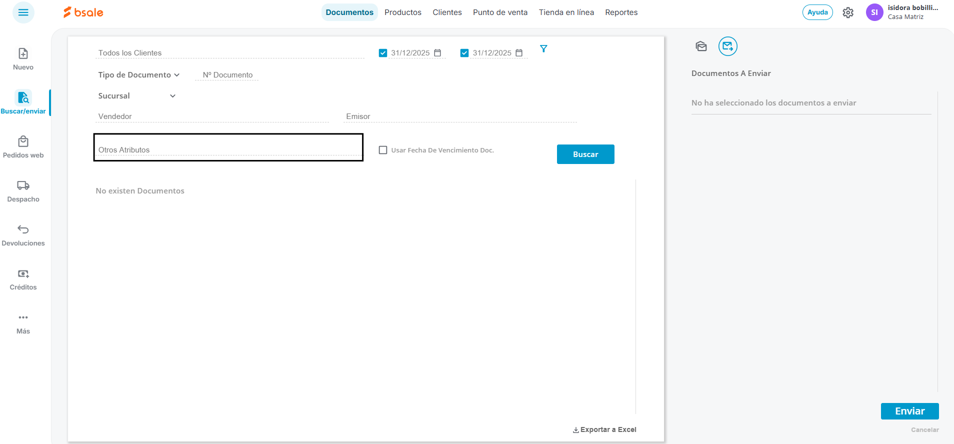 Ventas: Todas las ventas que se generen a través de Walmart, viajarán automáticamente a Bsale, las cuales emitirán una Boleta o una Factura inmediatamente, este documento tendrá en un campo de referencia el número de órden de Walmart y los pueden encontrar en la sección Documentos -> Buscar / Enviar -> “+” al lado del rango de fecha -> Otros atributos -> Pegar el número de órden de Walmart -> Buscar por número de orden.