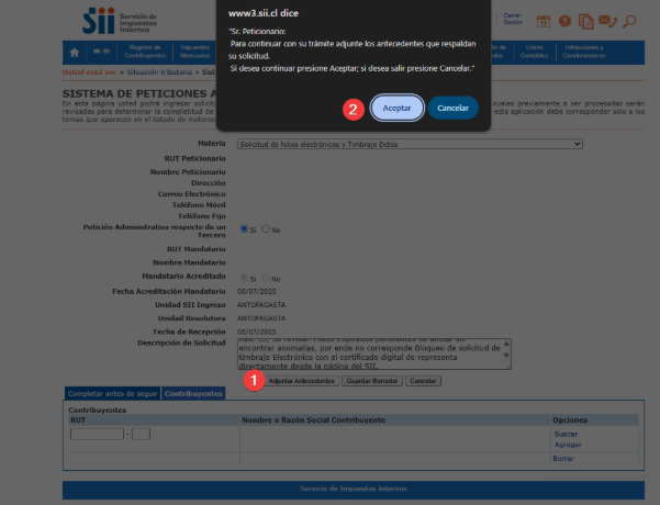 4. Adjuntar Antecedentes: Al hacer click aparece un Pop UP con mensaje, debemos seleccionar aceptar