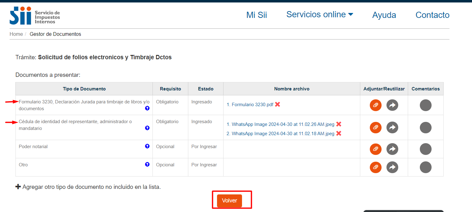5. Luego debe adjuntar el Formulario 3230 y la cédula de identidad por ambos lados del Representante Legal de la empresa, previamente descargada>Volver
