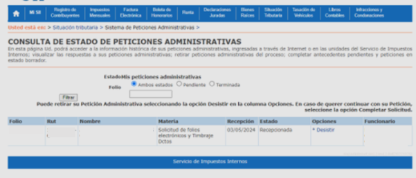 Servicios Online > Peticiones Administrativas y Otras solicitudes> Consultar Estado de Peticiones Administrativas