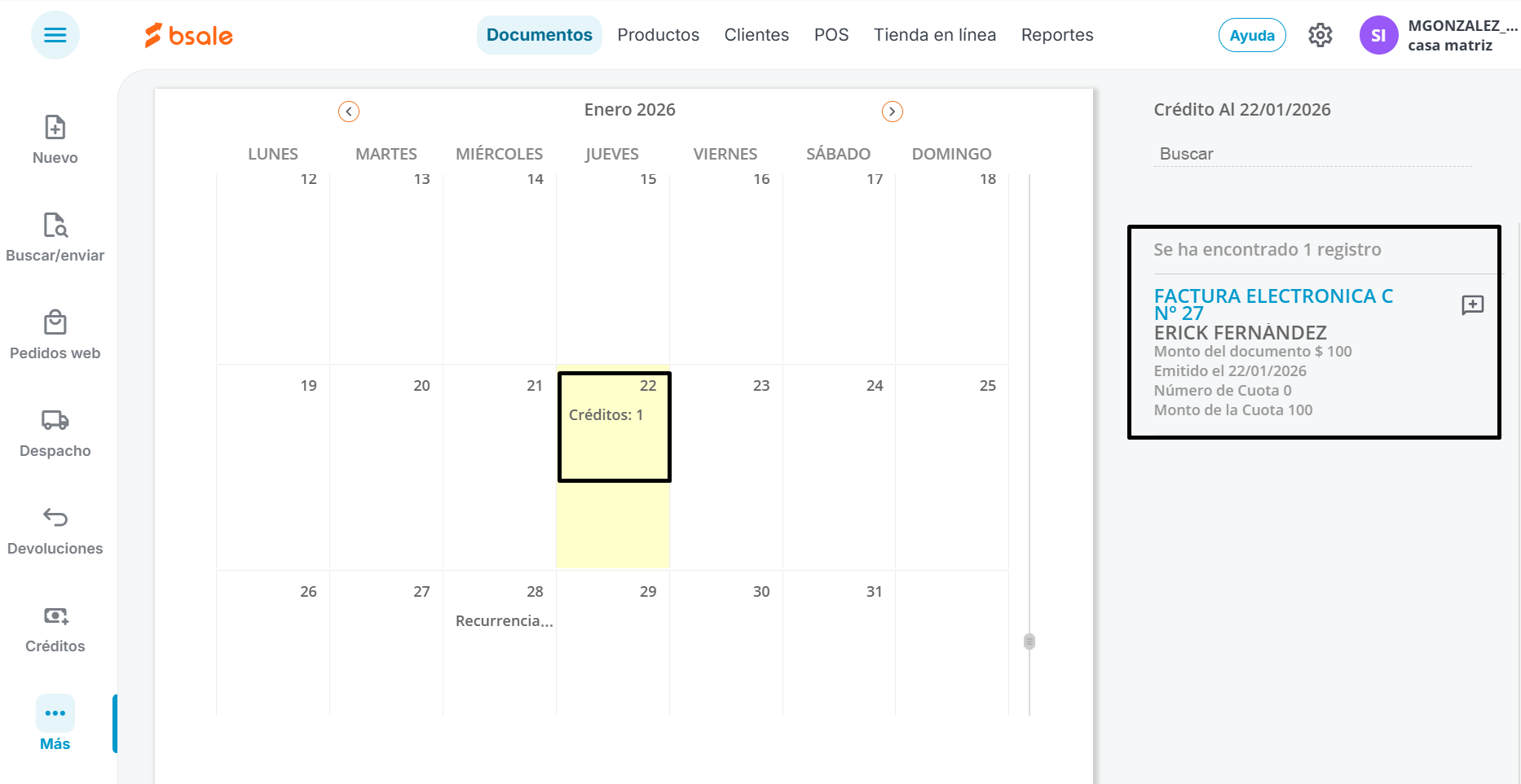 En el Calendario, se mostrarán las renovaciones pendientes de generar, documentos emitidos con fecha de vencimiento ( créditos) y podrás ver los documentos relacionados al hacer clic en el aviso marcado.