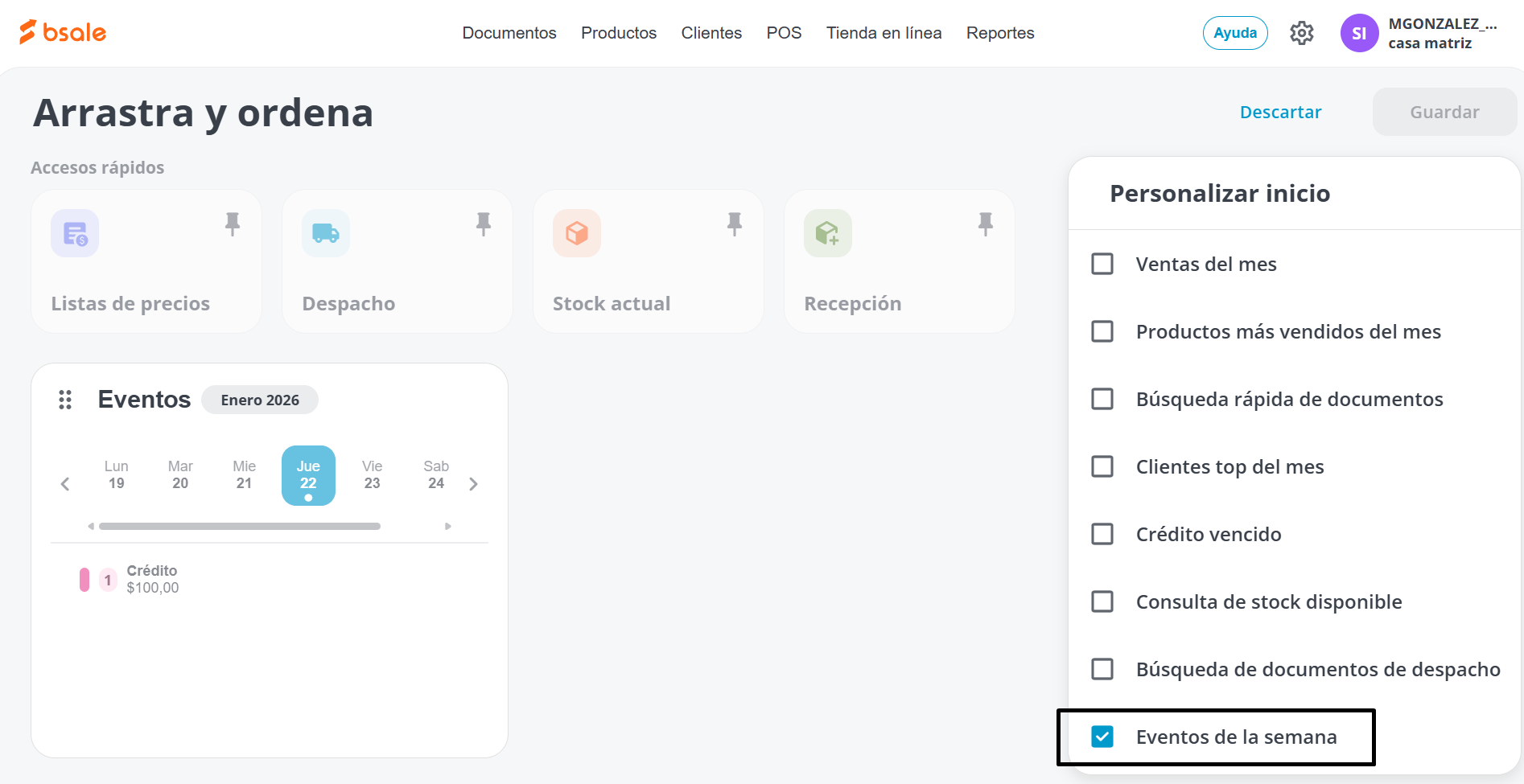 Selecciona la opción Eventos de la semana, da clic en Guardar. Esto mostrará el Calendario en la ventana principal. Esto te permitirá visualizar lo que tengas pendientes de generar así como los créditos.