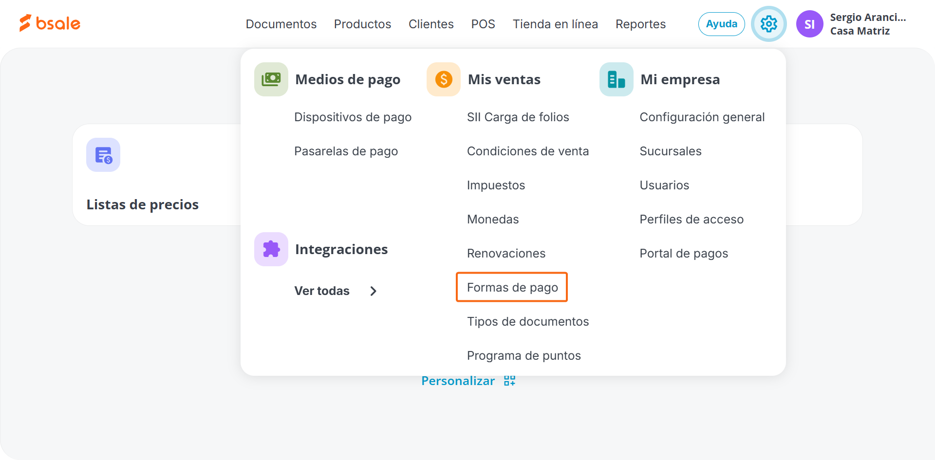1. Ingresa a Engranaje > Mis ventas y presiona en Formas de pago.