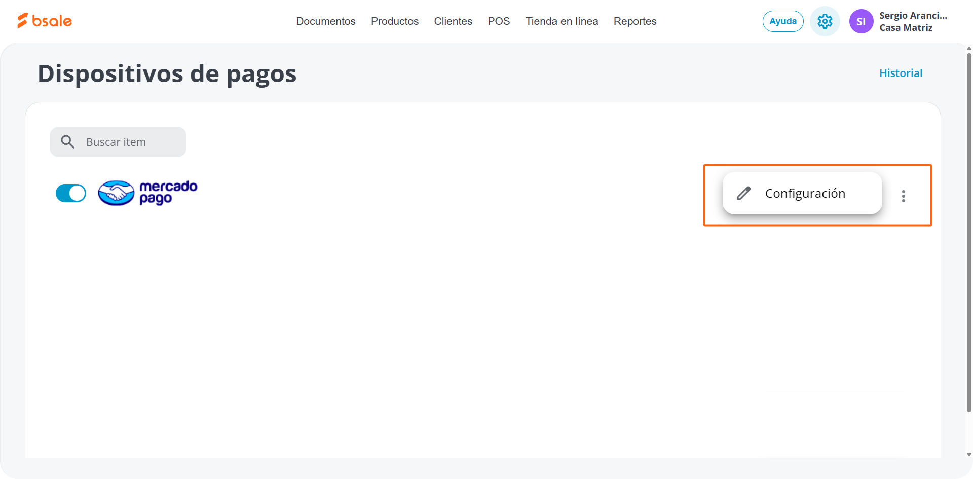 - Busca la opción Mercado Pago, haz clic en los tres puntos (...) y selecciona Configuración.