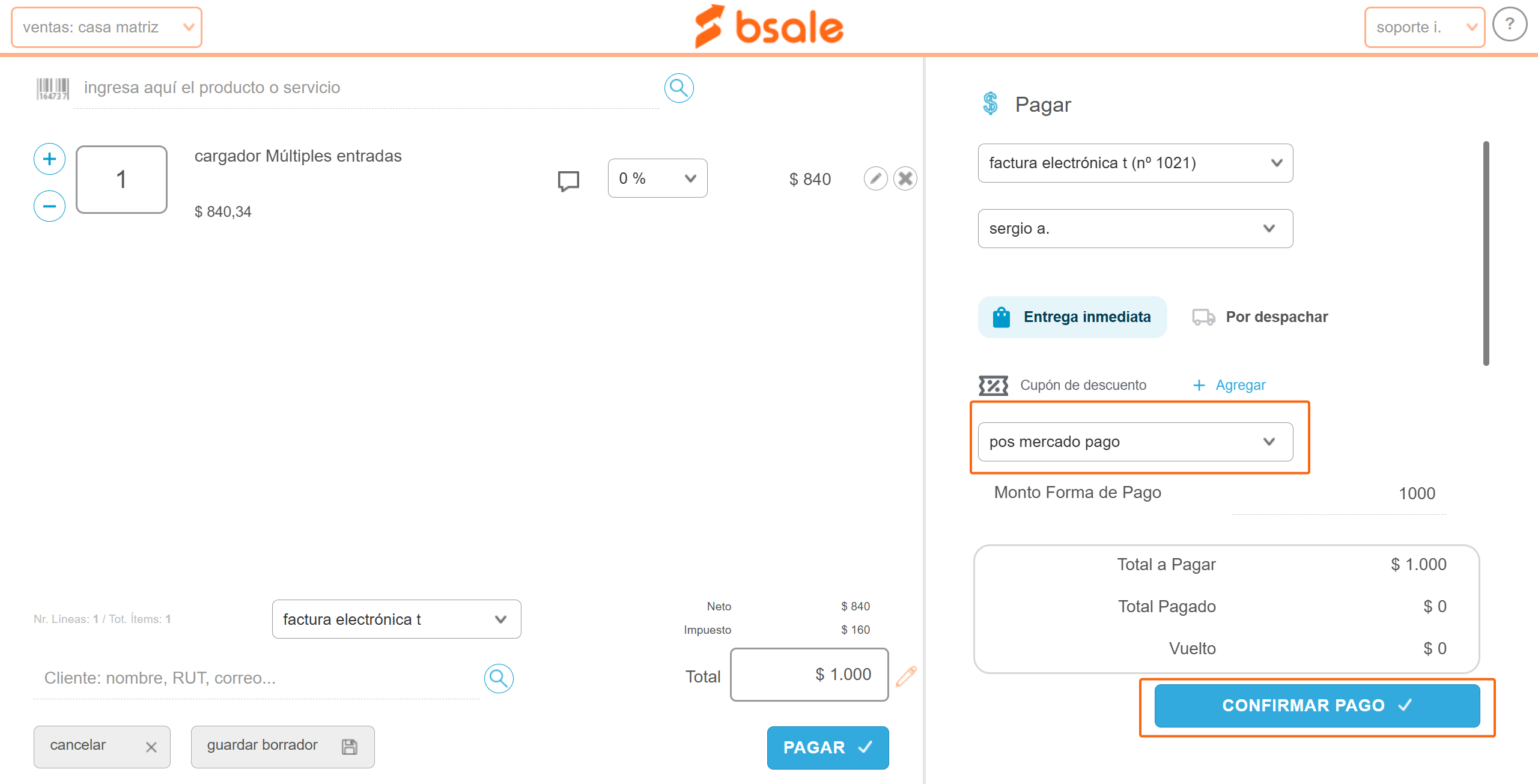 - Selecciona la forma de pago POS MERCADO PAGO.