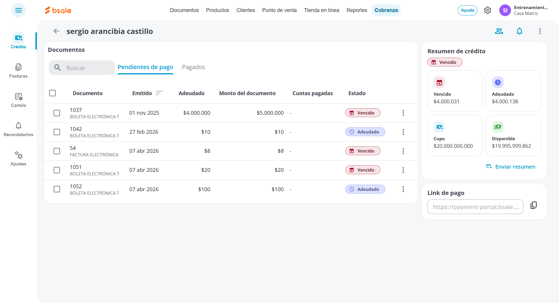 - El sistema abrirá una nueva vista de la ficha del cliente donde verás, de forma predeterminada, la pestaña de Pendientes de pago con el detalle de los documentos, fechas, montos totales y saldos adeudados.