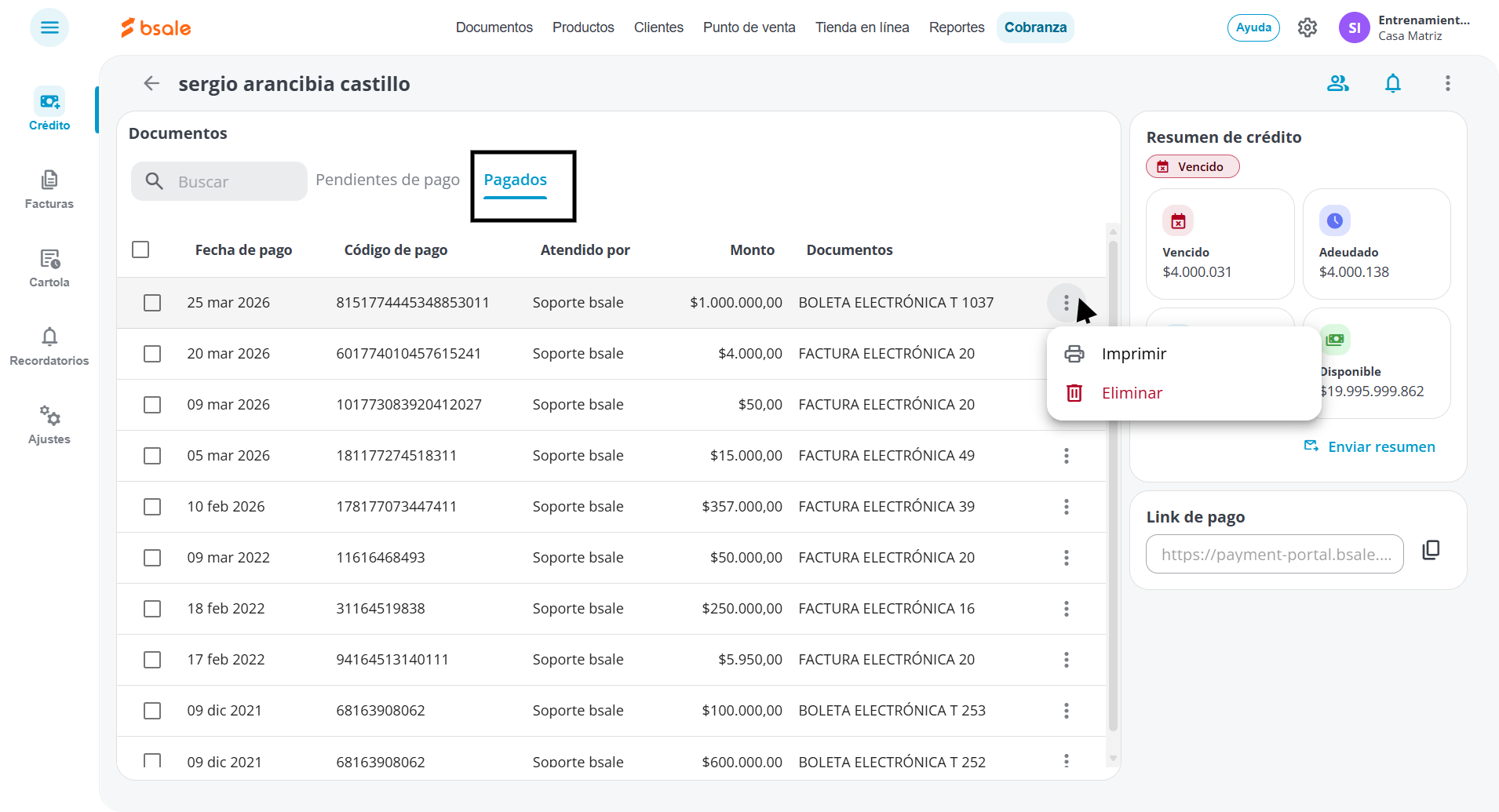 - Anular un pago: Si registraste un pago por error, selecciona Eliminar pago. El documento desaparecerá de esta lista y volverá automáticamente a la pestaña Pendientes, restaurando la deuda del cliente.