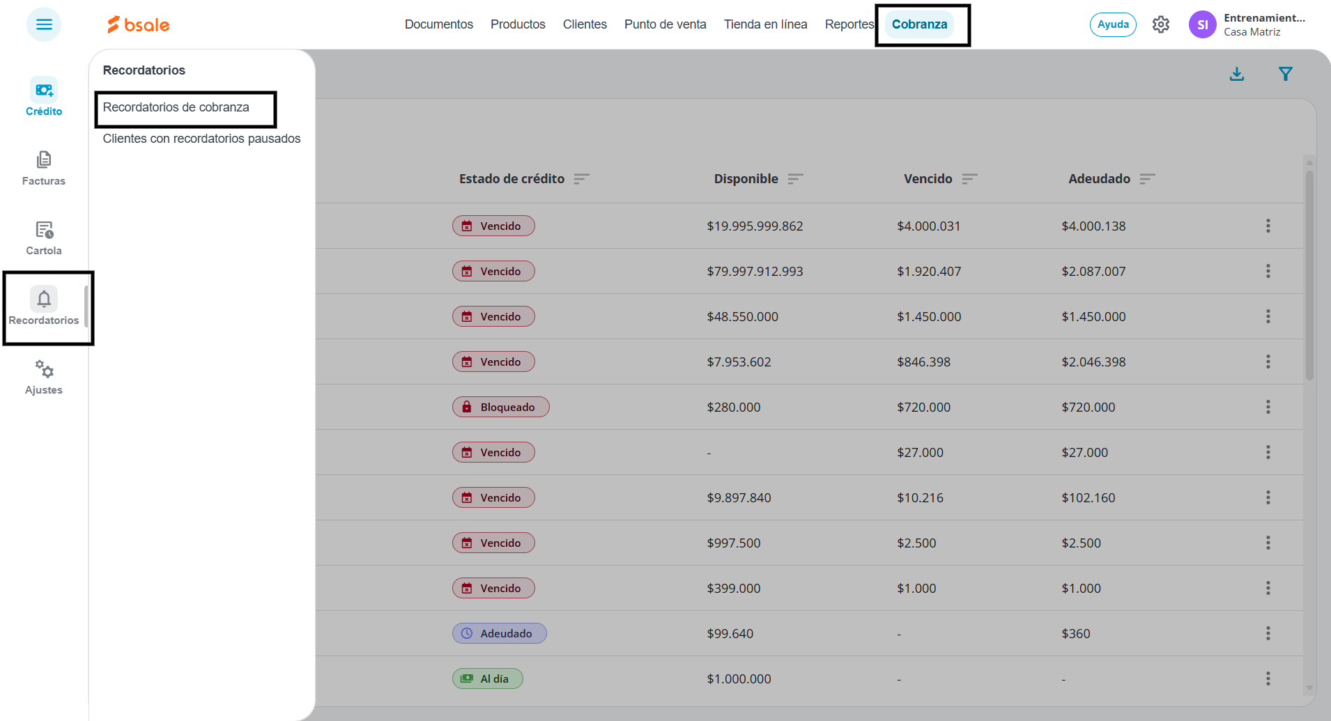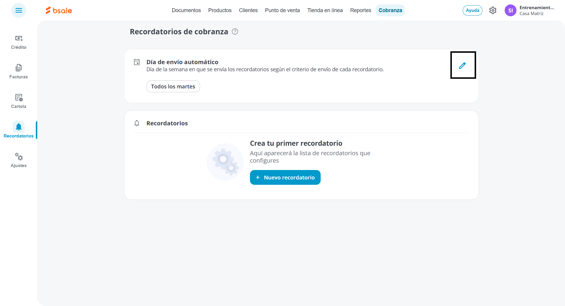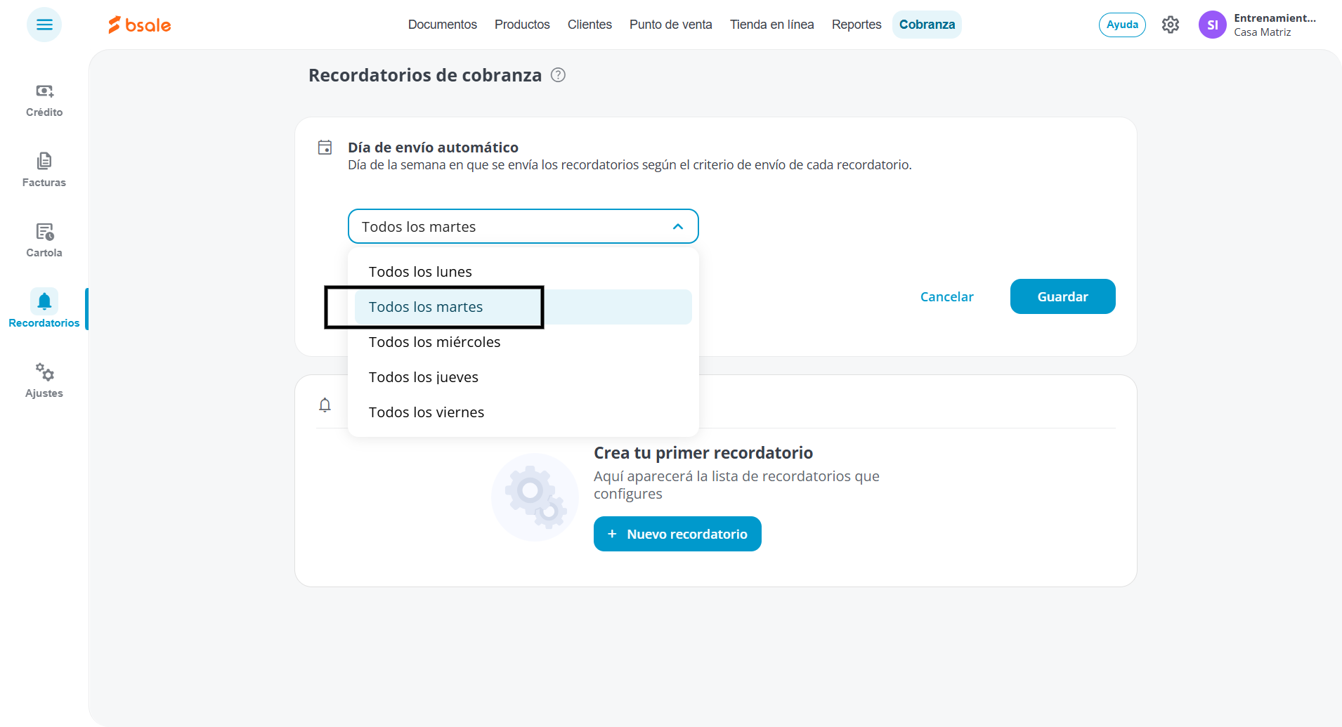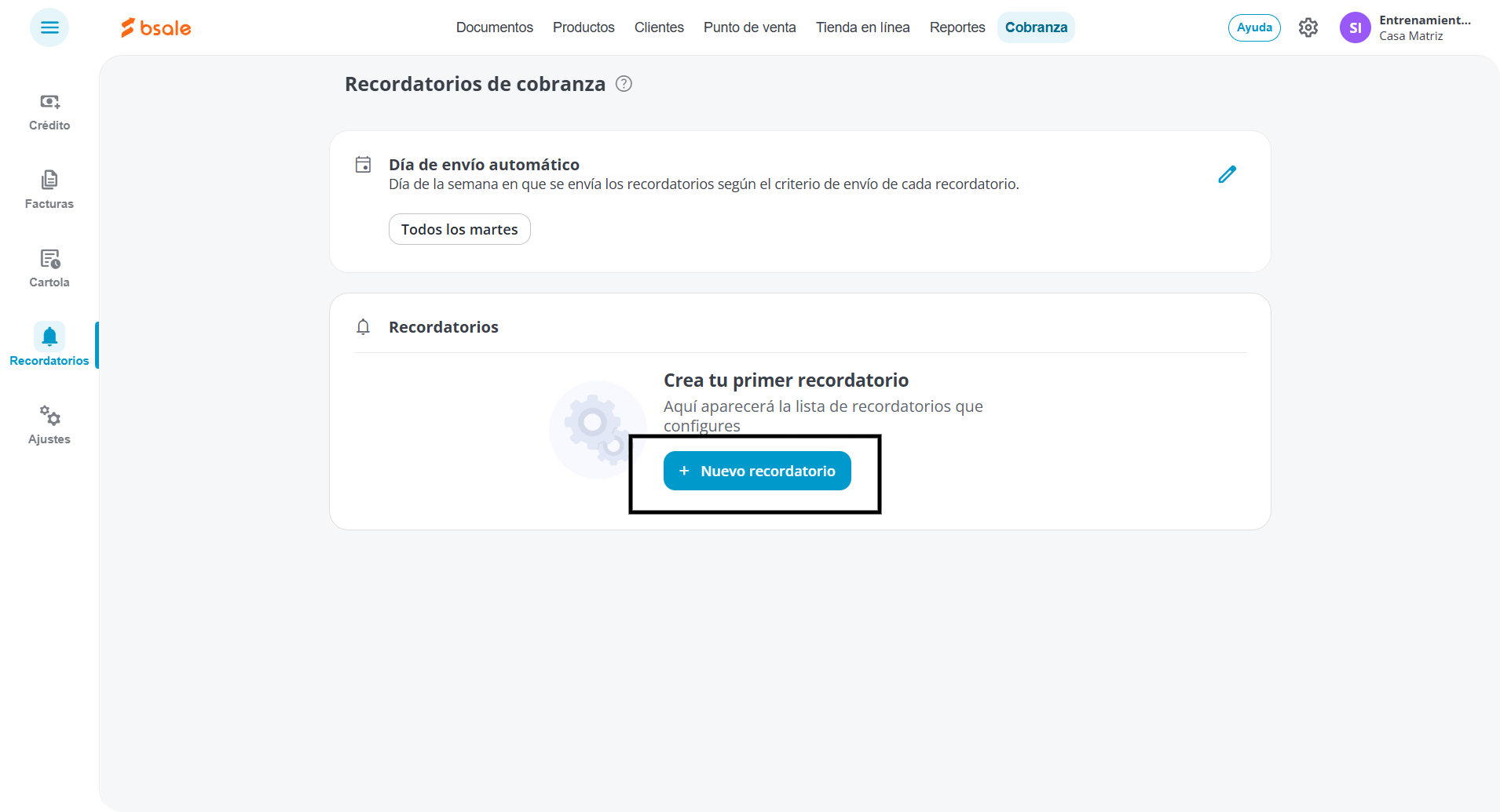 En el menú superior, presiona en Cobranza, luego selecciona Recordatorios y finalmente haz clic en Recordatorio de cobranza.