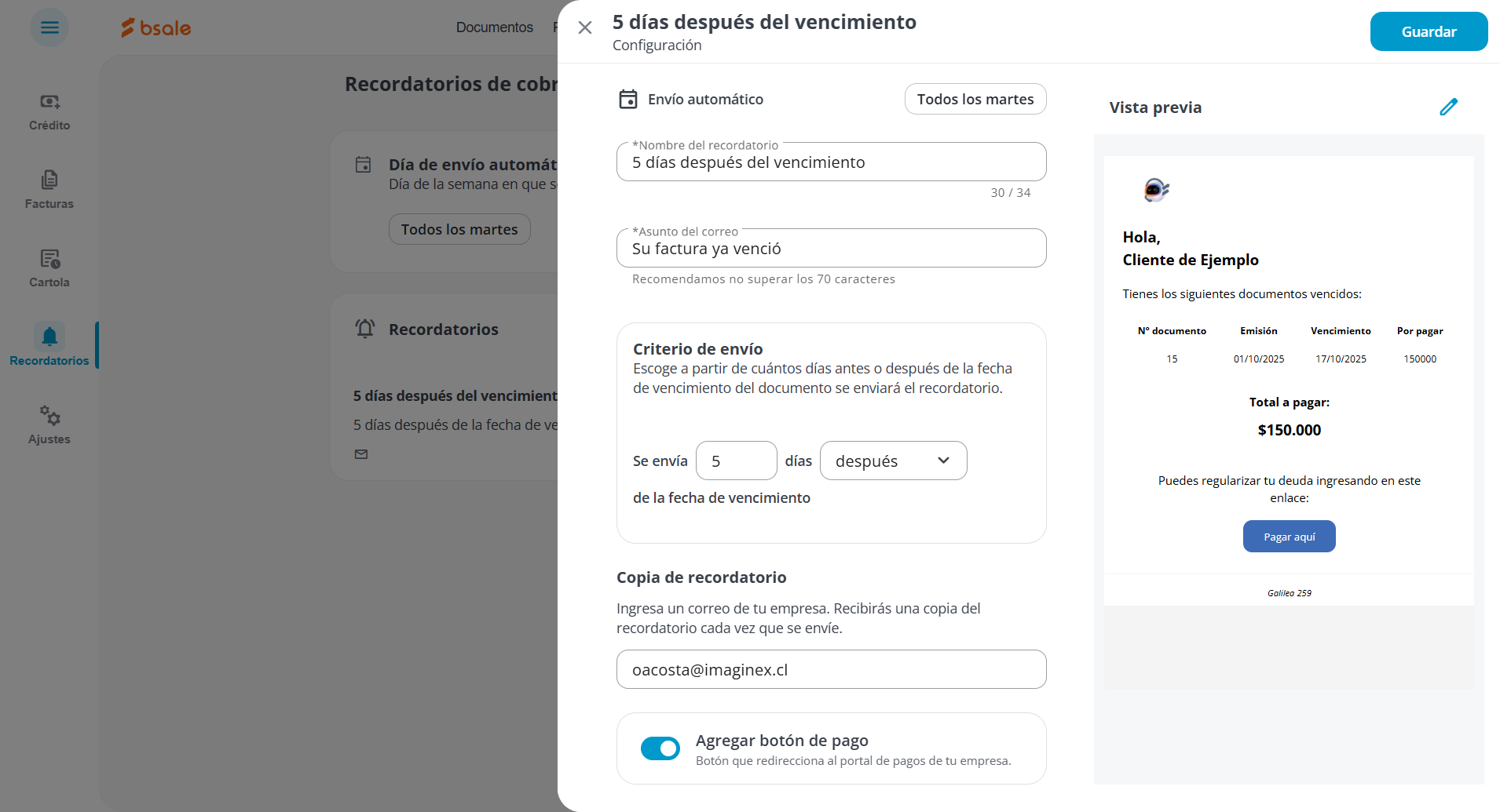 - Por ejemplo, si configuras el día de envío todos los martes y creas un recordatorio que se envíe 5 días después de la fecha de vencimiento entonces, un documento que vence el lunes 20 de enero, el correo se saldrá el martes 28 de enero.